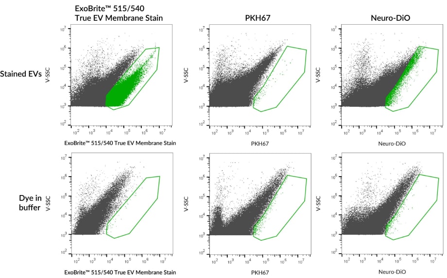 Results demonstrate ExoBrite™ 515/540 True EV Membrane Stain is more effective at staining EVs and is less susceptible to dye aggregation than PKH67 membrane dye.