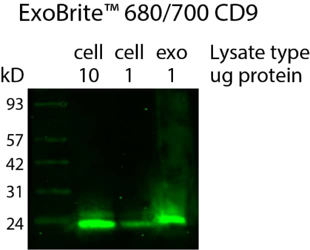 | ExoBrite™ CD9 Western Antibody | ExoBrite™ 680/700 ExoBrite™ 770/800 HRP | 25 tests 100 tests 50 tests (HRP only) | P003-680, P003-HRP |