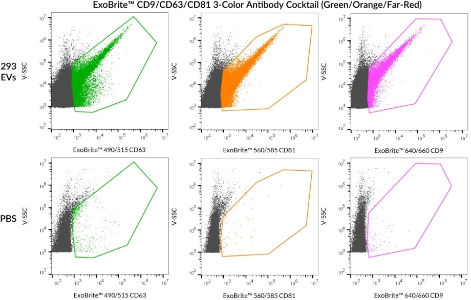 | ExoBrite™ CD9/CD63/CD81 3-Color Antibody Cocktail (Blue/Green/Far-Red) | 411/452 nm 490/516 nm 642/663 nm | Pacific Blue® FITC APC | 25 tests | P028-125 |