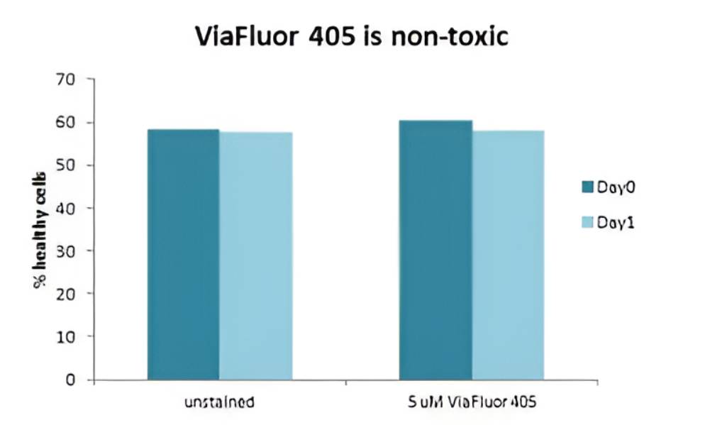 ViaFluor® 405 SE does not show any toxicity when used at 5 uM in either cultured Jurkat cells or PBMCs. ViaFluor® 405 is equal to CellTrace™ Violet in terms of lack of toxicity and great peaks in flow cytometry.