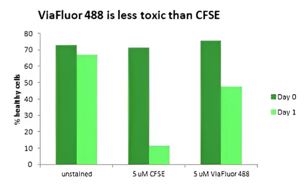 ViaFluor® 488 SE is a green cell proliferation dye, designed as an improvement to CFSE. ViaFluor® 488 has many advantages over CFSE, including reduced cell toxicity. When used at 5 uM, CFSE is extremely harmful to cells, while in the same experiment ViaFluor® 488 is much less destructive. At 1 uM, we haven’t seen any toxicity at all with ViaFluor® 488.