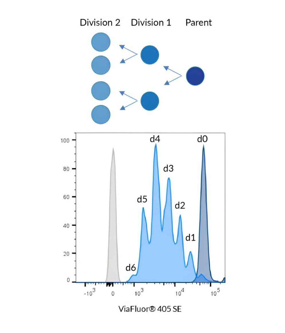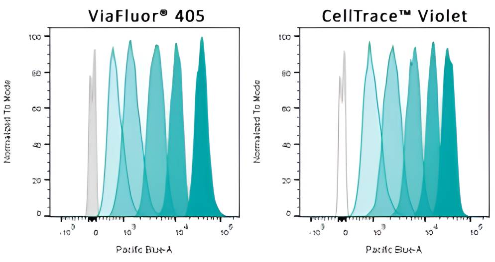 ViaFluor® 405 is an excellent cell proliferation dye. Unlike some other dyes, it is non-toxic and does not interfere with cellular processes, such as cell cycle progression or T cell activation. The signal is bright and stable, giving sharp peaks that allow you to track cell division cycles by flow cytometry. When compared to the cell proliferation dye CellTrace™ Violet, they look identical in terms of staining pattern and lack of toxicity.