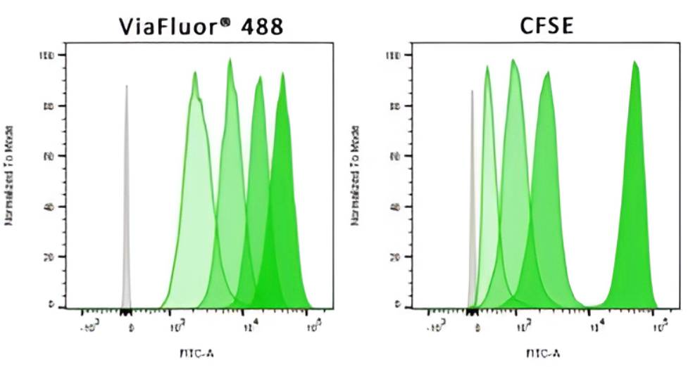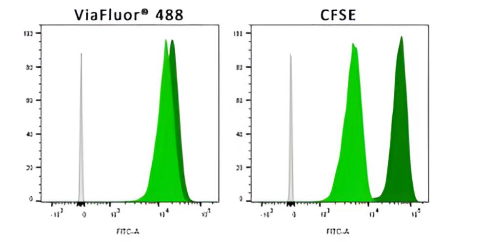 Although CFSE remains widely used, Biotium recognized that CFSE has several flaws that can interfere with experiments: it shows cell toxicity, can alter the kinetics of T cell activation, is not well retained in the cell, is not well retained after fixation, and bleeds into other detection channels. Therefore Biotium developed a new green cell proliferation dye, ViaFluor® 488, that improves on all of these properties.