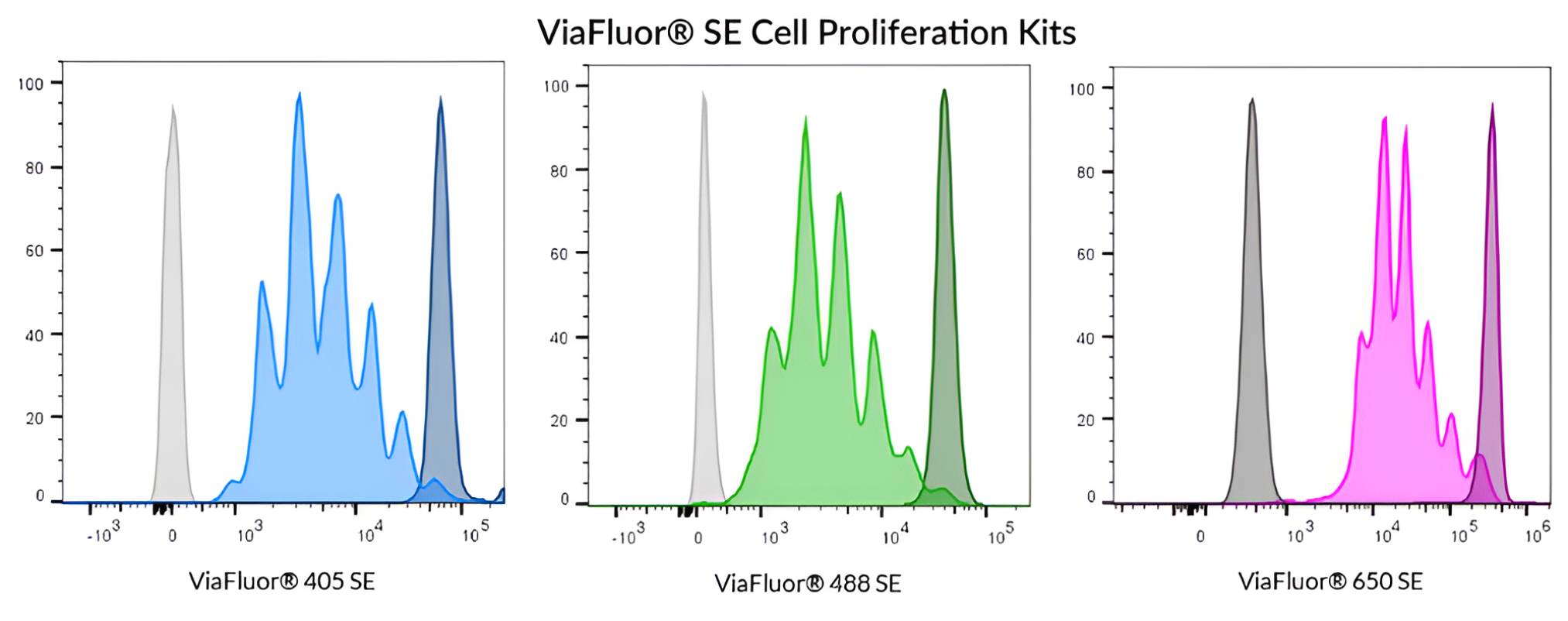 | ViaFluor® 405 SE Cell Proliferation Kit | 30068 | 408/452 | Pacific Blue® | • Track cell division by dye dilution using flow cytometry • ViaFluor® 488 is a unique, improved green dye to replace CFSE • ViaFluor® 405 replaces CellTrace™ Violet • ViaFluor® 650 replaces CellTrace™ Far Red |