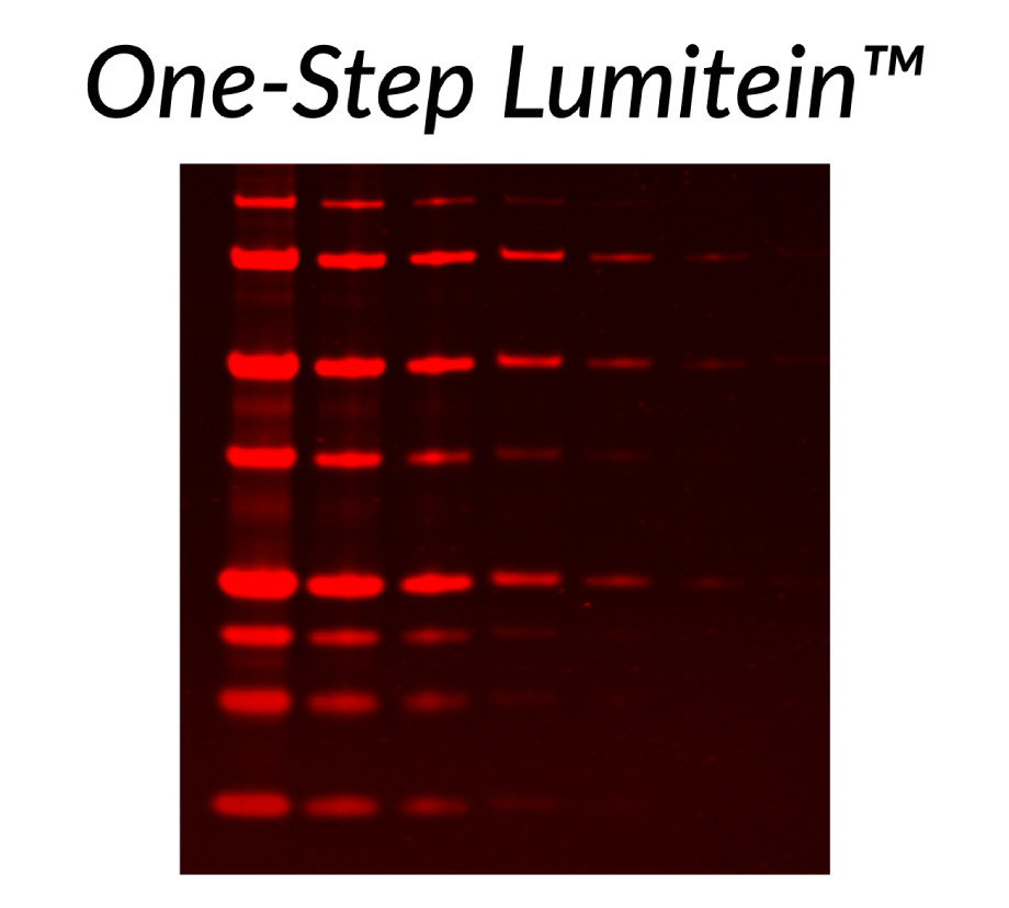 One-Step Lumitein™ is a SYPRO® Ruby alternative, compatible with UV or blue light transilluminators and laser scanners.