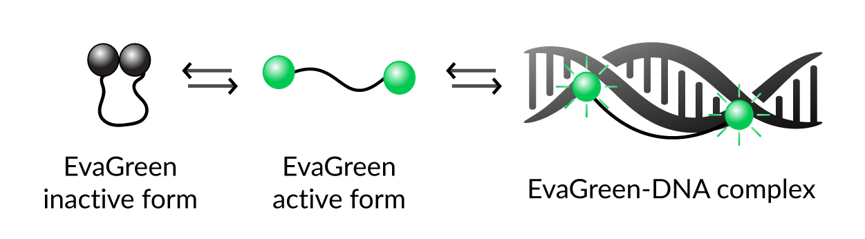 EvaGreen® DNA-binding dye uses a novel "release-on-demand" mechanism. The dye consists of two monomeric DNA-binding units linked by a flexible spacer. Without DNA, it forms an inactive looped conformation. When DNA is present, it shifts to a conformation that binds DNA and emits fluorescence. This equilibrium continuously supplies active dye as more DNA forms during PCR.