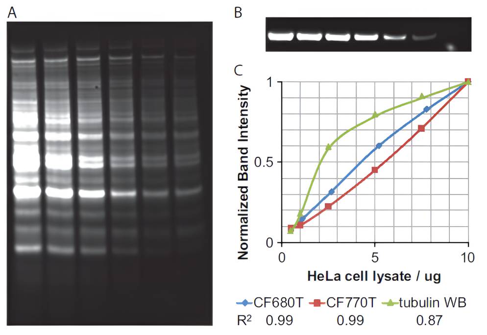 VersaBlot™ Total Protein Normalization Kits allow simple, sensitive, and highly linear protein quantitation on SDS-PAGE gels and western blot membranes. The kits label purified proteins or cell lysates with near-infrared CF® Dyes before running samples on SDS-PAGE. Proteins can be visualized on a gel or membrane using a fluorescent gel scanner. The prestain can be reversed, facilitating downstream multi-color western blot analysis.